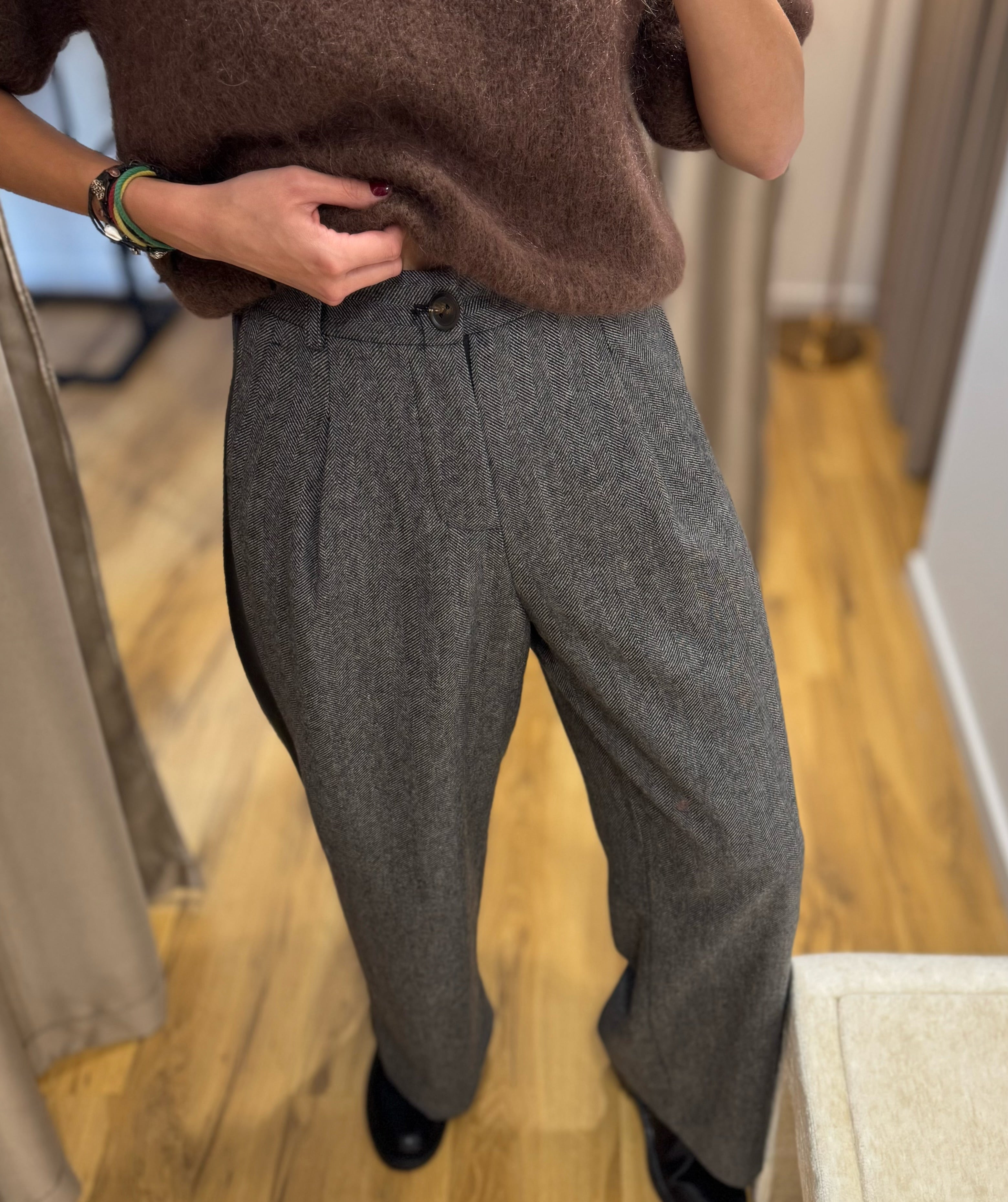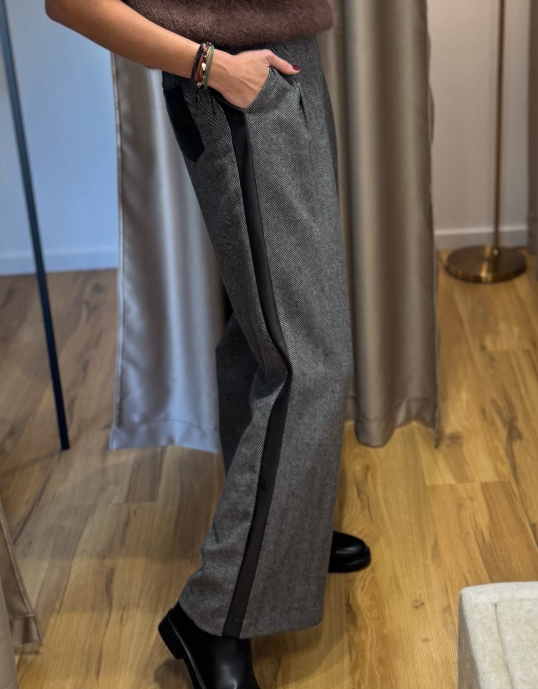 Klasikinio kirpimo kelnės su odos detalėmis ir 50% lanos vilna ✨